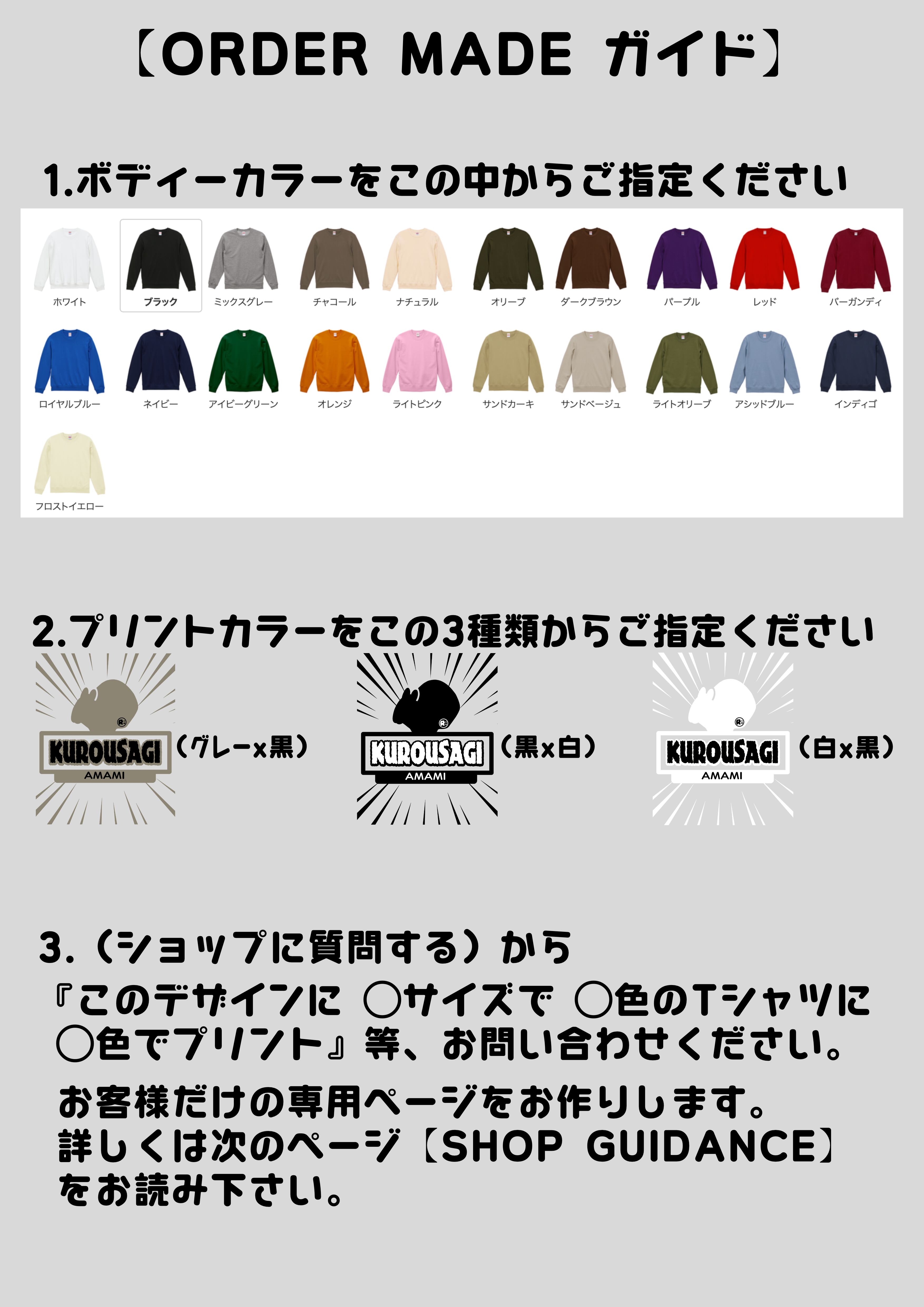 『このデザインに ◯サイズで ◯色のTシャツに ◯色でプリント』等、ご要望に合わせてお客様専用の注文ページをお作りいたします。