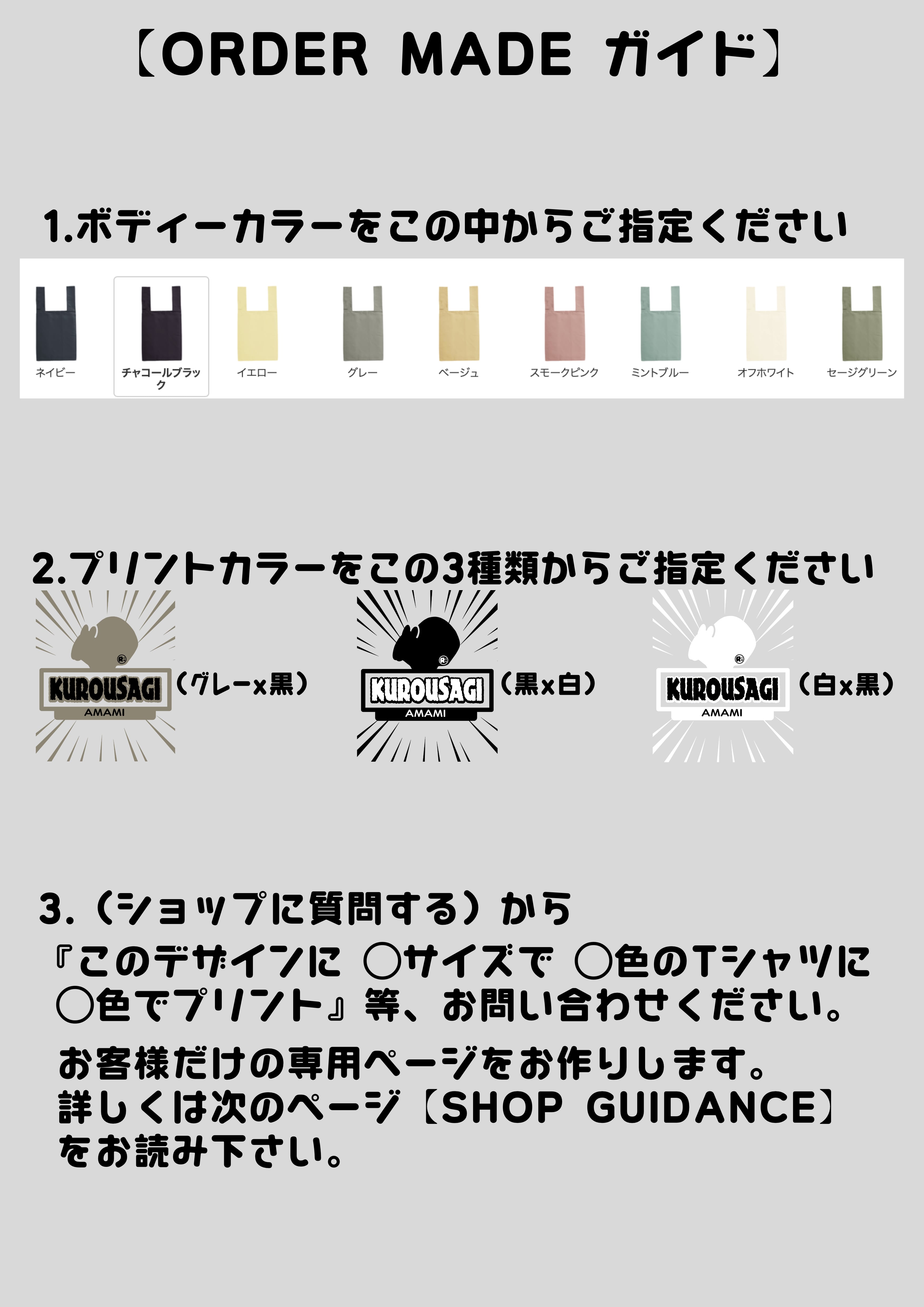 『このデザインに ◯サイズで ◯色のTシャツに ◯色でプリント』等、ご要望に合わせてお客様専用の注文ページをお作りいたします。